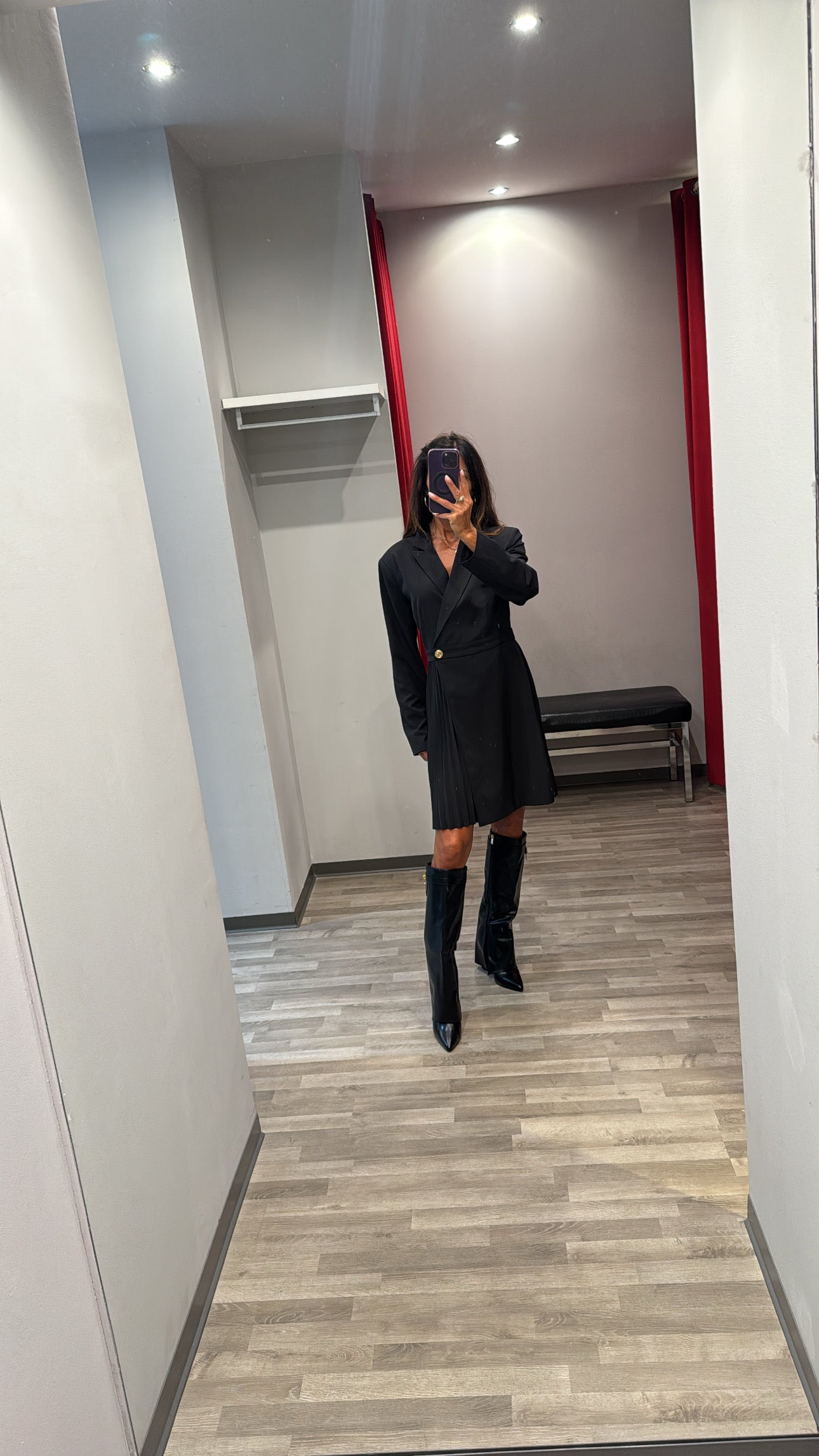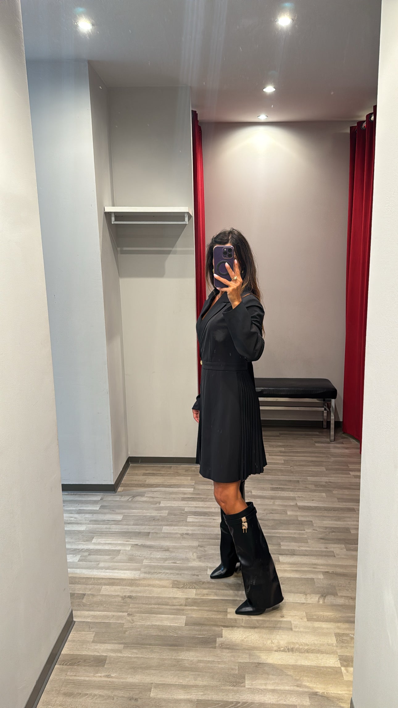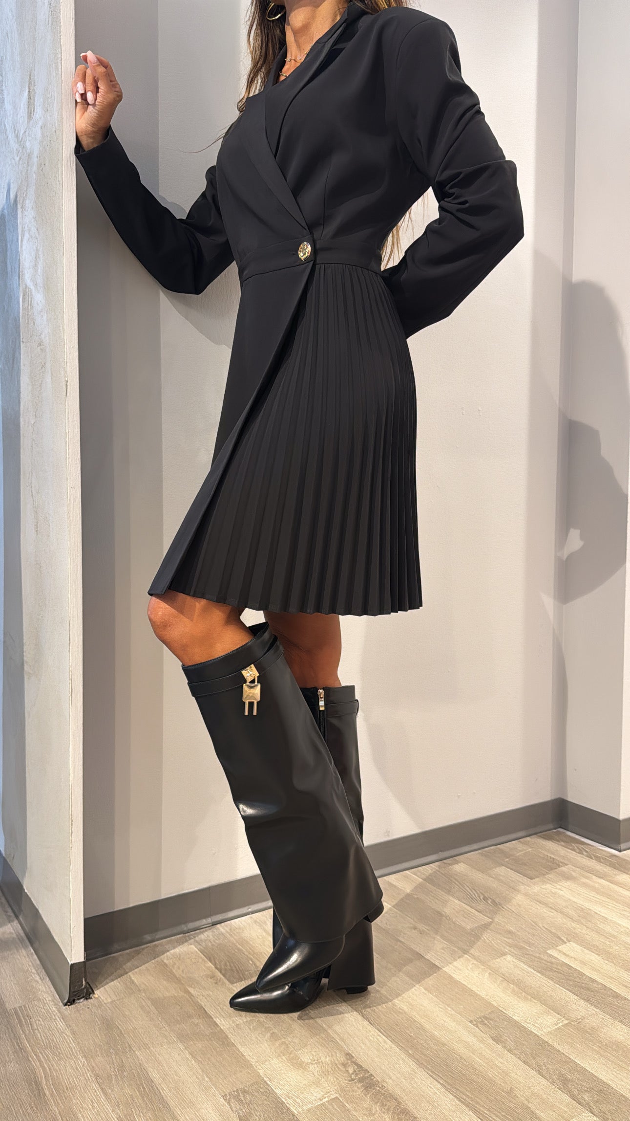 ABITO NERO A GIACCA CON CHIUSURA DOPPIPETTO CON BOTTONE ORO E MEZZA GONNA PLISSE