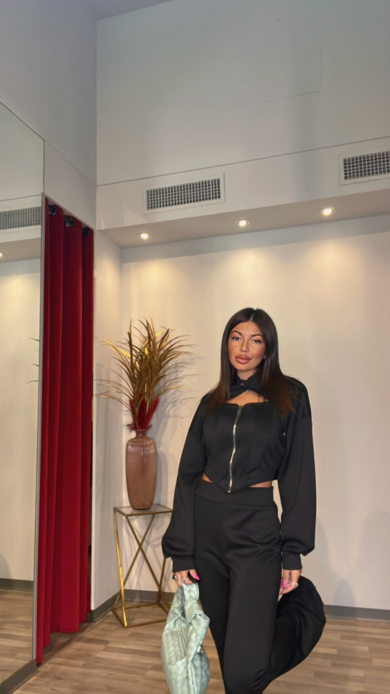 COMPLETO NERO COMPOSTO DA PANTALONE STRETTO A ZAMPA CON ELASTICO IN VITA ELASTICIZZATO , BUSTINO CON COPPE E CERNIERA ARGENTO E FELPA CROP A MANICHE LUNGHE CON CHIUSURA BOTTONE NEL COLLO
