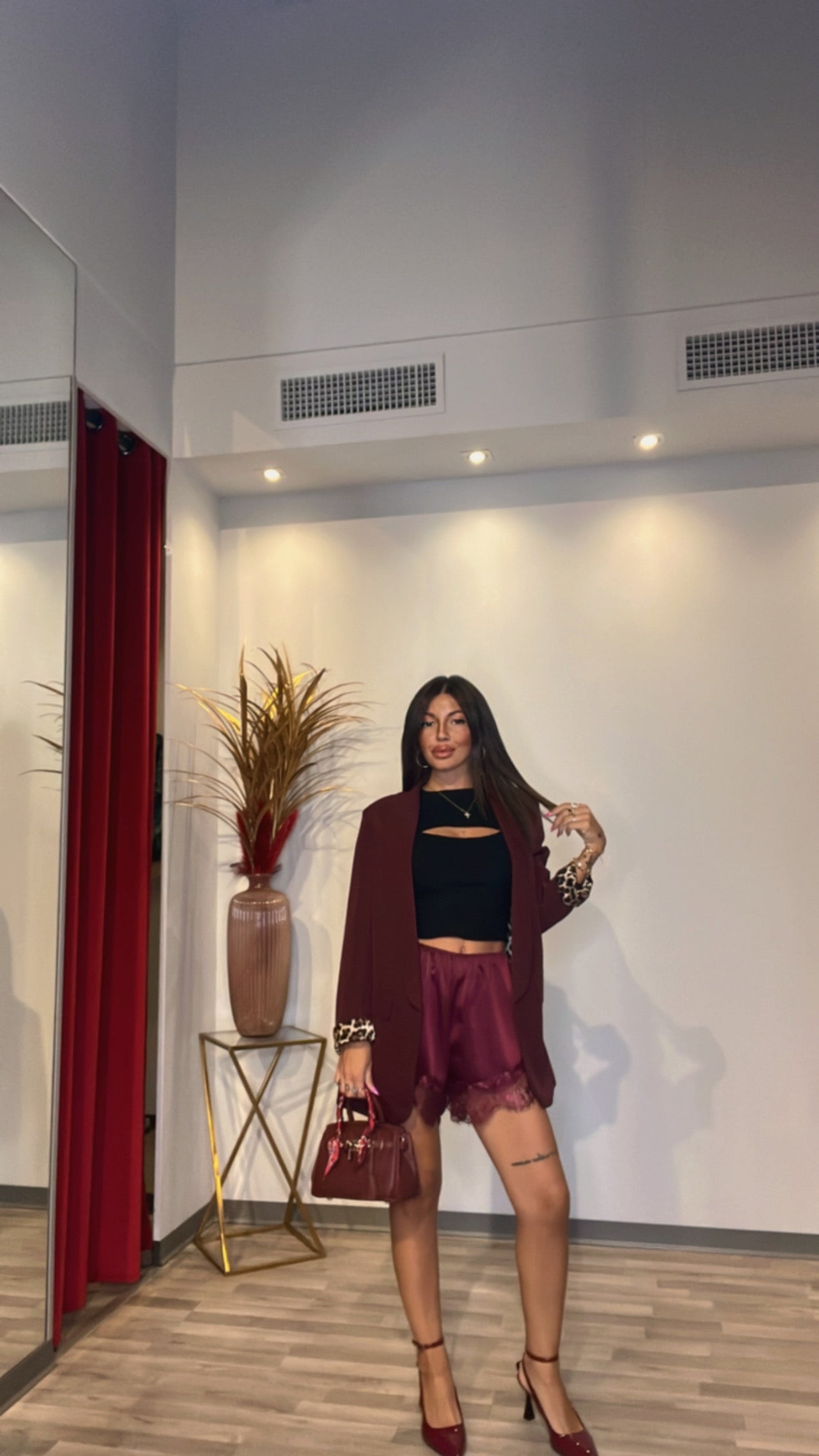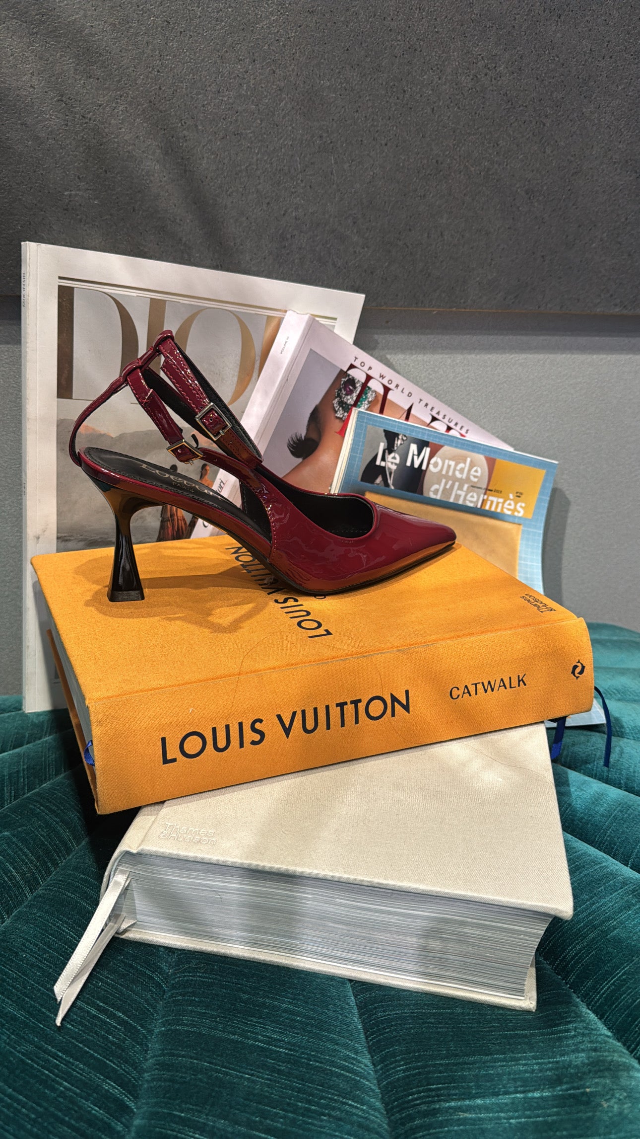 DECOLTÈ VERNICE BORDEAUX CON CINTURINO ALLA CAVIGLIA E TACCO COMODISSIMO A ROCCHETTO 8 CM
