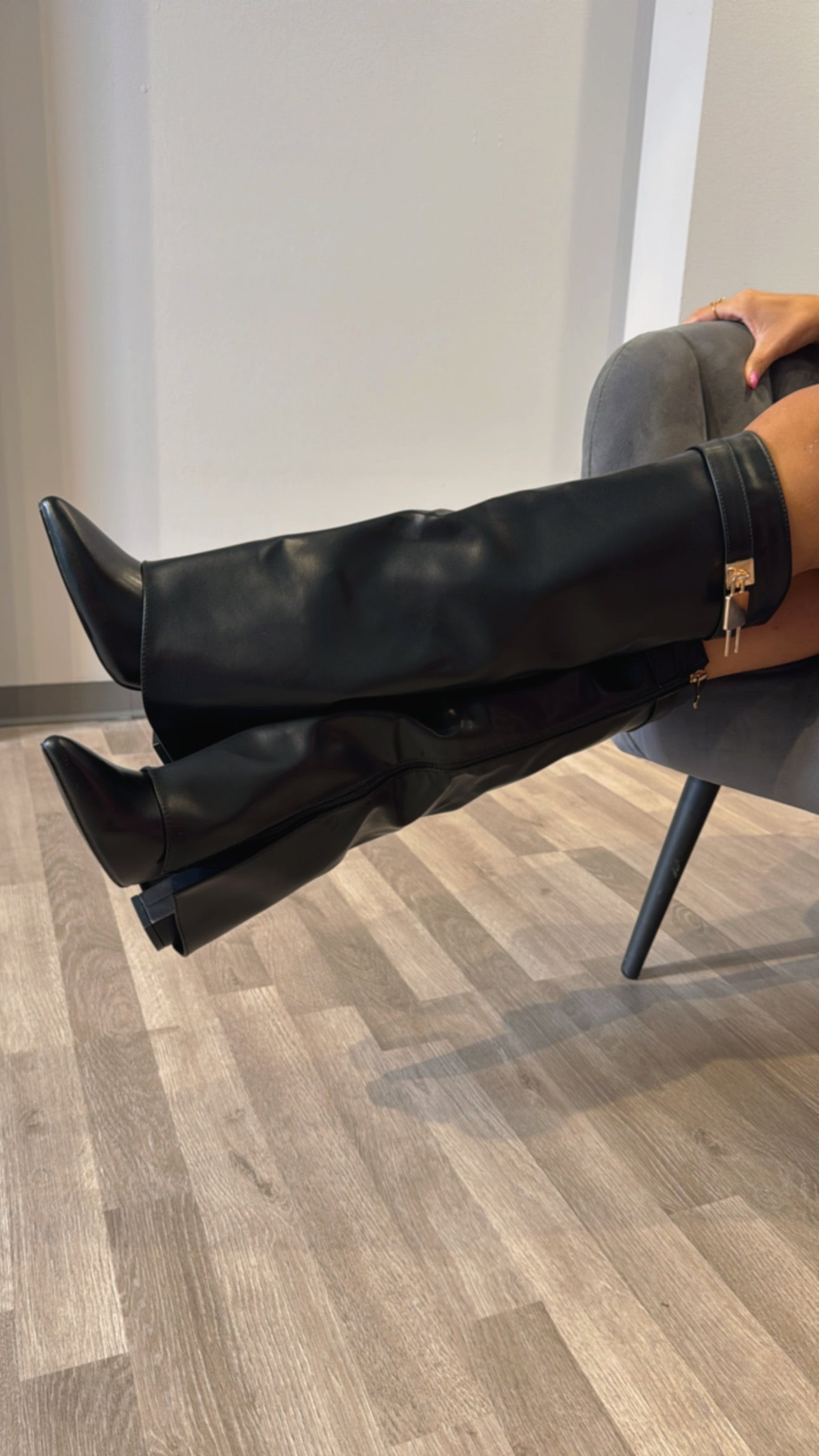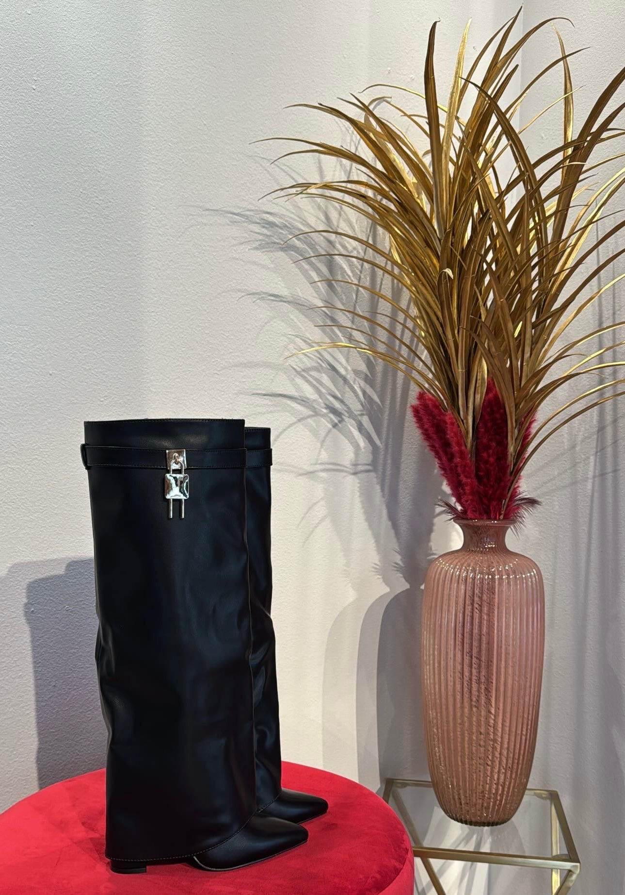 STIVALE IN ECOPELLE VEGANO NERO CON TACCO ALTO RICOPERTO DALLA CLASSICA GHETTA IN STILE GIVENCHY CON LUCCHETTO A LATO ORO , CERNIERA INTERNA