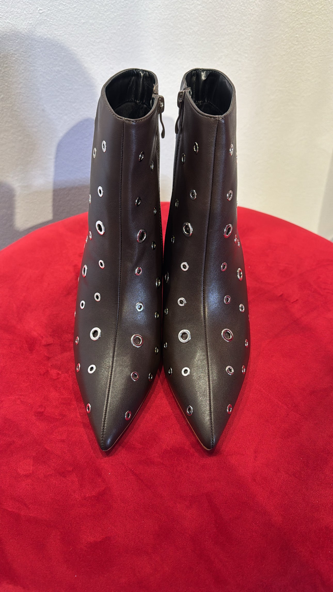 STIVALETTI IN ECOPELLE VEGANA MORBIDISSIMI A PUNTA MARRONI CON TACCO 8 CM E OCCHIELLI ARGENTO E CERNIERA INTERNA
