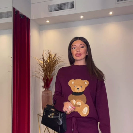 CORD SET IN VISCOSA MORBIDISSIMO COLOR BORDEAUX COMPOSTO DA MAGLIONCINO MANICA LUNGA CON ORSETTO PELOSINO E PANTALONE LARGO CON COULISSE IN VITA